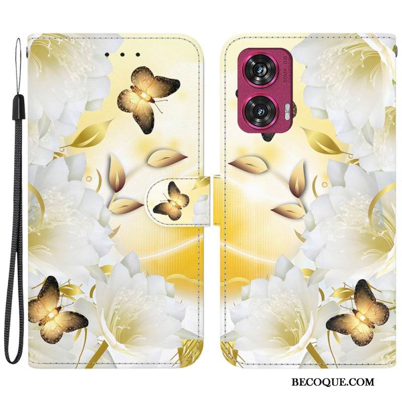 Kotelot Motorola Edge 50 Fusion Kultaisia Perhosia Ja Valkoisia Kukkia Hihnalla