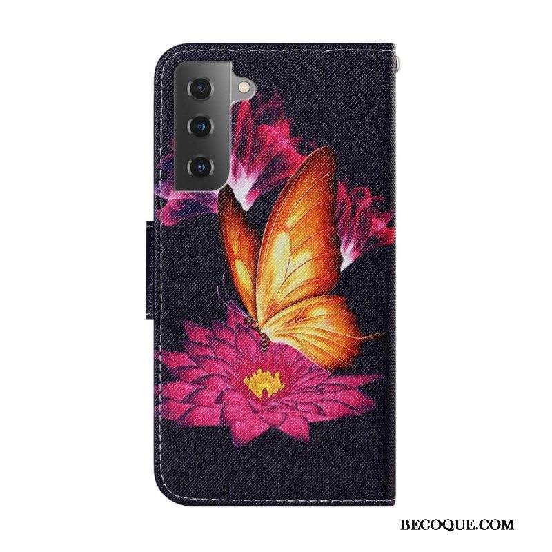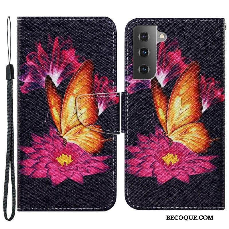 Nahkakotelo Samsung Galaxy S22 Plus 5G Perhosia Lennossa Lanyardin Kanssa