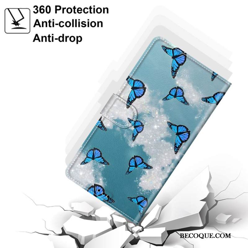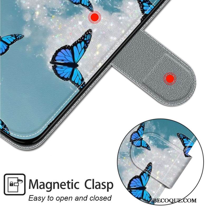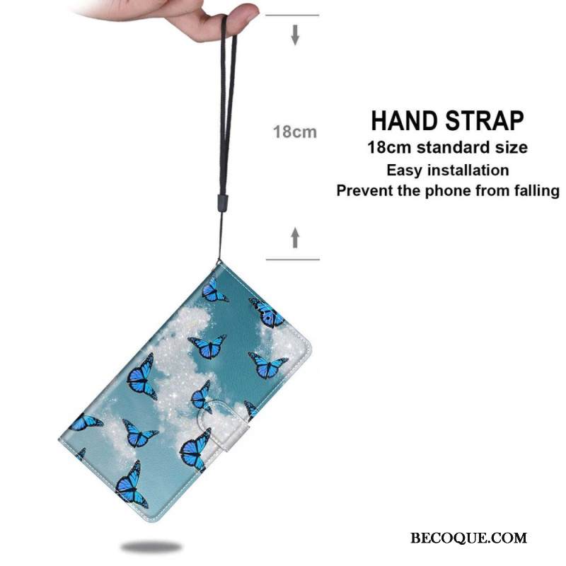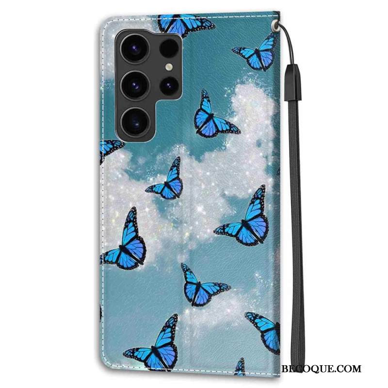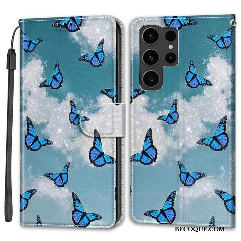 Kotelot Samsung Galaxy S24 Ultra 5g Valkoiset Pilvet Ja Siniset Perhoset Hihnalla