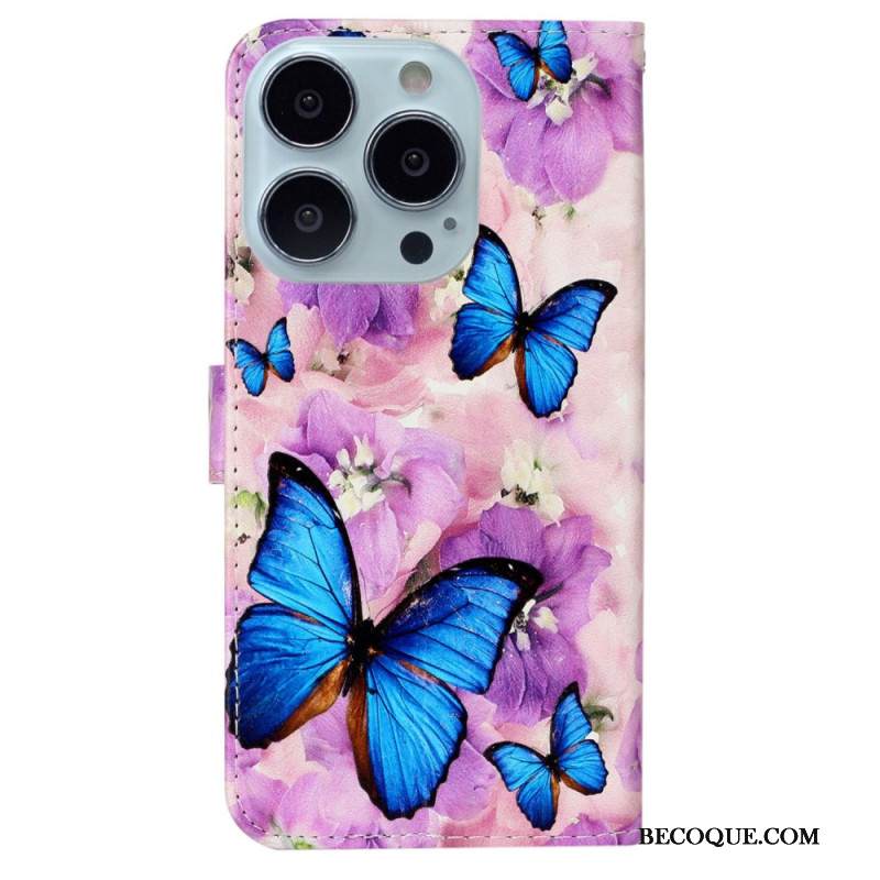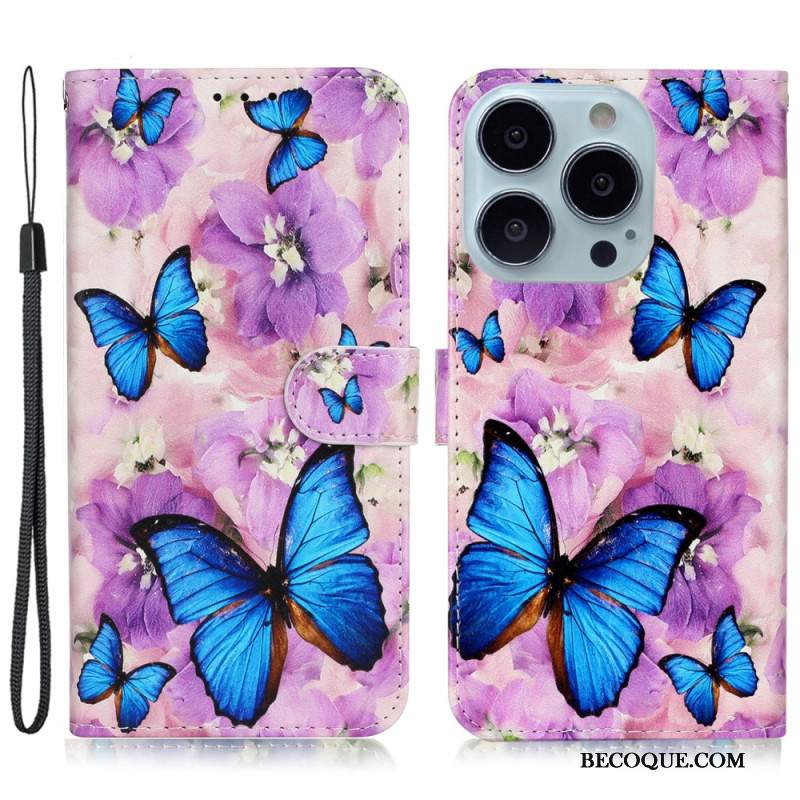 Kotelot iPhone 16 Pro Max Perhosia Ja Violetteja Kukkia Hihnalla