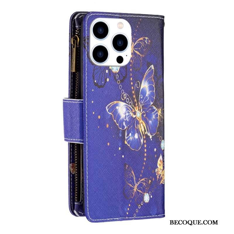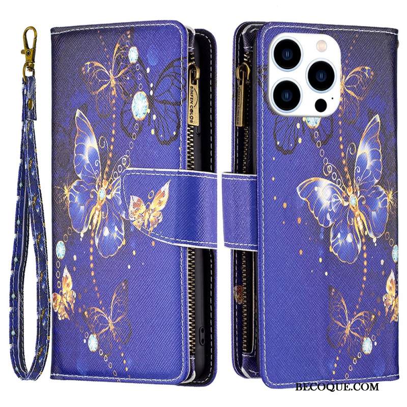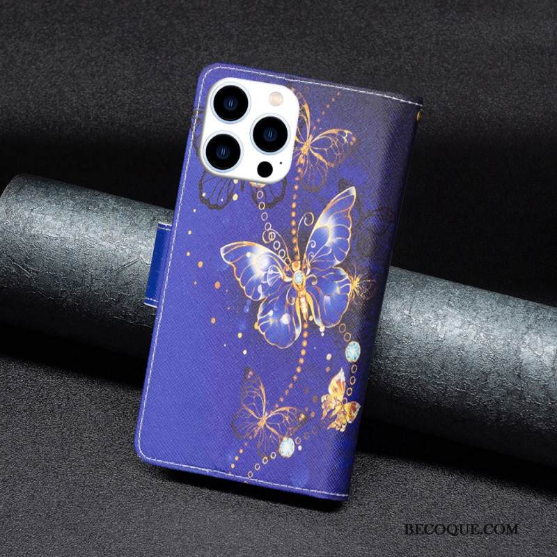 Kotelot iPhone 16 Pro Max Purple Butterflies -lompakko Hihnalla