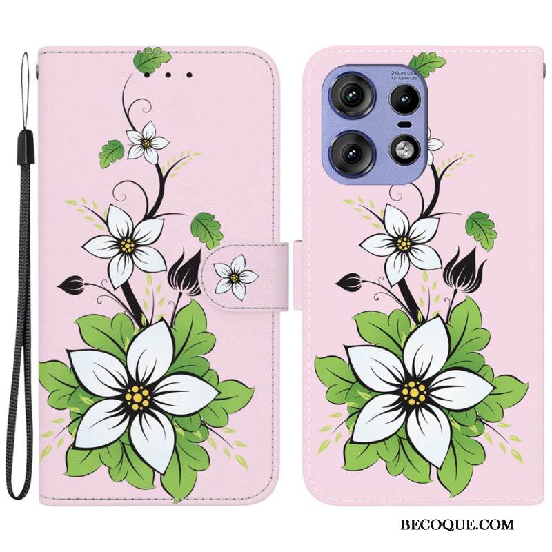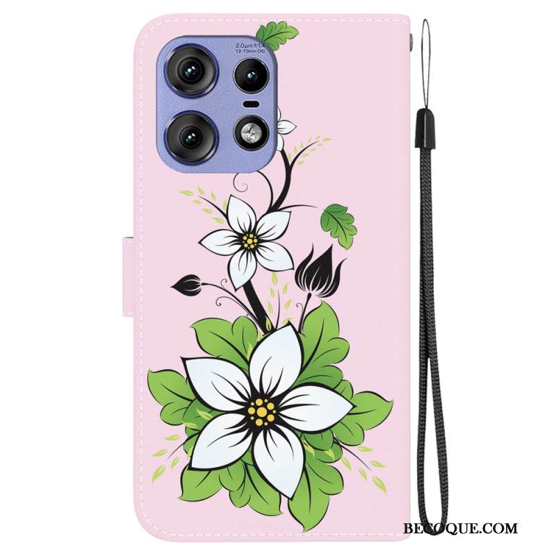 Nahkakotelo Motorola Edge 50 Pro Valkoiset Kukat Hihnalla