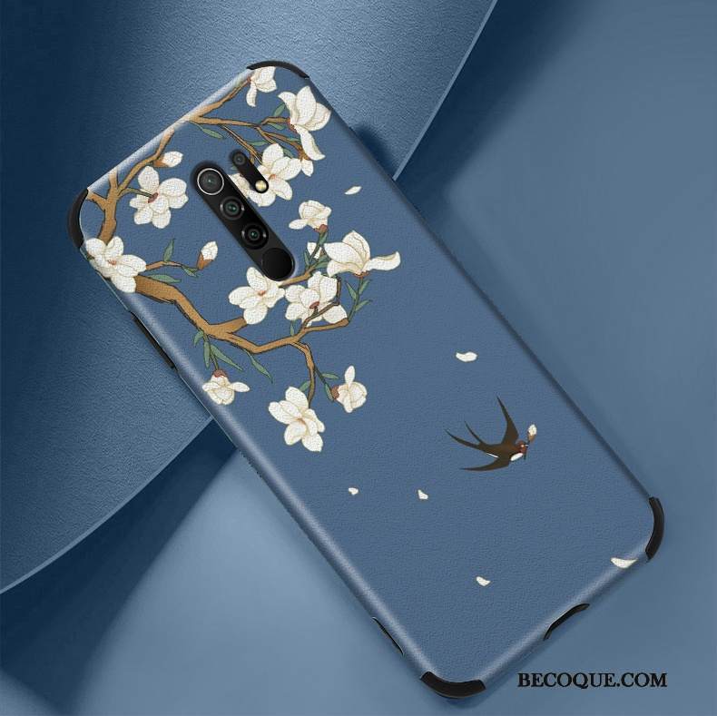 Kuori Redmi 9 Nahka Punainen Sininen, Kotelo Redmi 9 Kohokuviointi Kukka Kiinalainen Tyyli