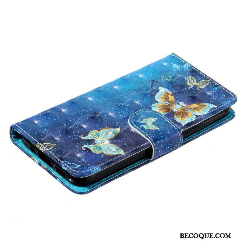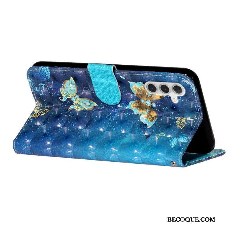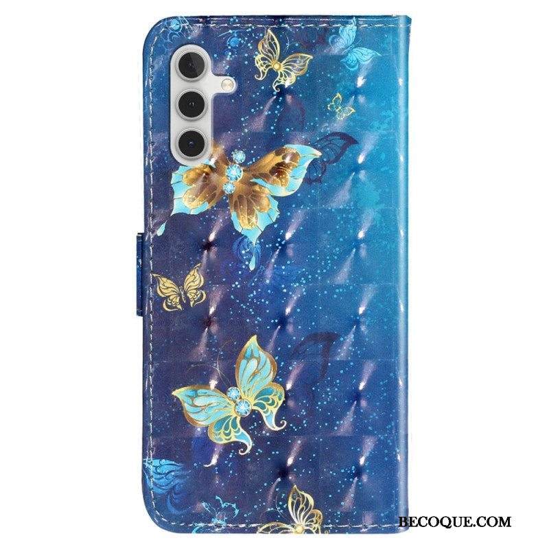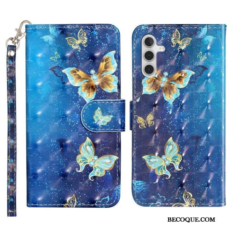 Nahkakotelo Samsung Galaxy A14 / A14 5G Suojaketju Kuori Kultaiset Perhoset Hihnalla
