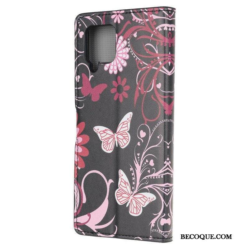 Nahkakotelo Samsung Galaxy M12 / A12 Perhosia Ja Kukkia