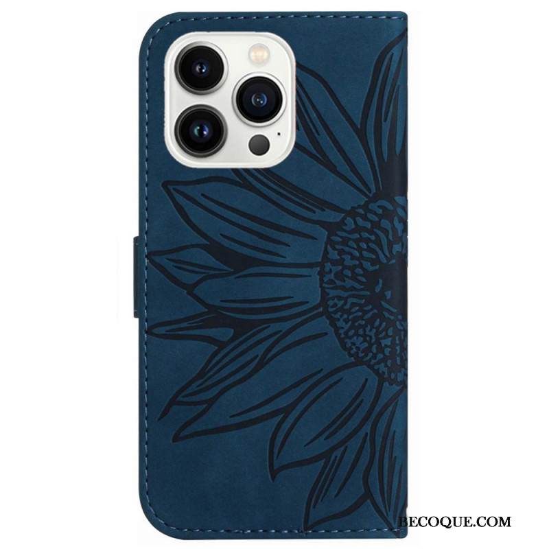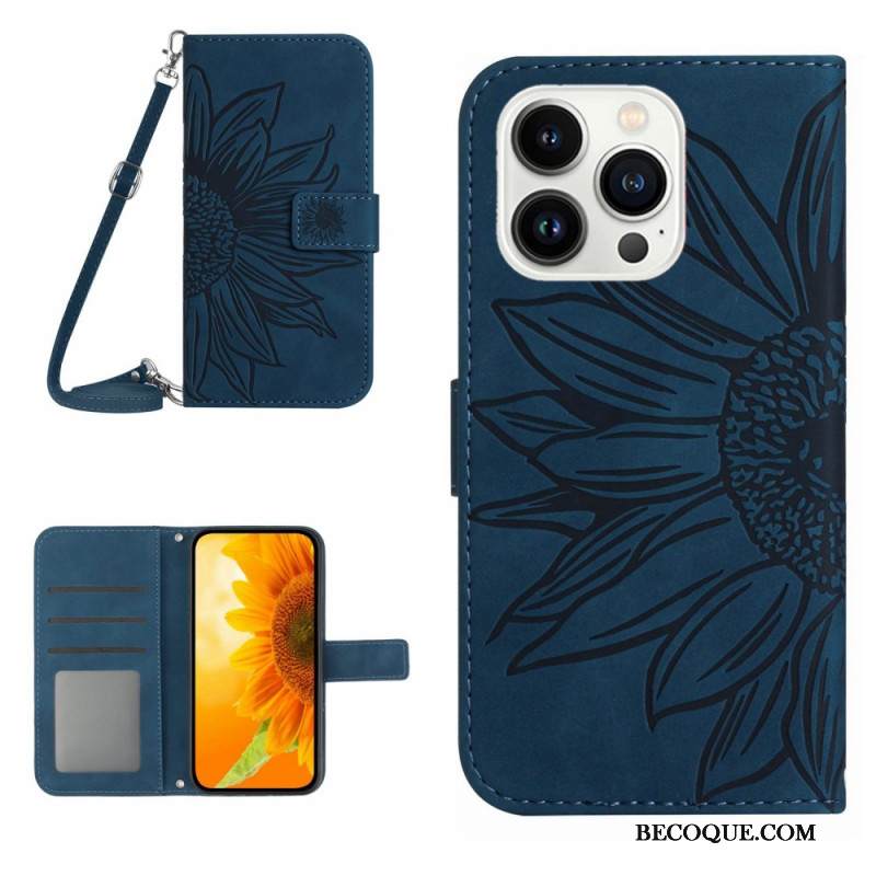 Nahkakotelo iPhone 16 Pro Auringonkukkaprintti Olkahihnalla